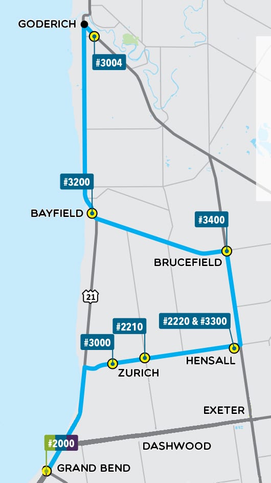 Stops include Sobeys Plaza in Grand Bend (HSAT bus hub), West Huron Care Centre (Bluewater Rest Home) on County Road 84, Victoria Lane & Main Street in Zurich, Hensall parkette, Hensall D&D Variety, Ellen St. S. & Mill Rd. in Brucefield (near Fire Station), Bayfield Town Hall and Walmart Supercentre in Goderich.